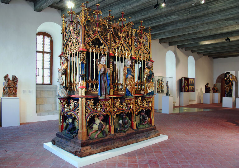 In den rekonstruierten Klosterräumen des Erdgeschosses – Kreuzgang, Refektorium, Kapitelsaal und Parlatorium – präsentiert das Museum mit der Ausstellung „Gotische Skulptur in Sachsen“ die bedeutendsten Sammlungen sakraler Kunst im Freistaat. Mit Arbeiten Hans von Cölns, des Meisters H.W. und dem Chemnitzer Heiligen Grab sind einzigartige Werke mittelalterlicher meißnisch-sächsischer Plastik und Tafelmalerei zu sehen. Die Ausstellung ist eine Kooperation der Staatlichen Kunstsammlungen Dresden mit den Kunstsammlungen Chemnitz / Schlossbergmuseum.